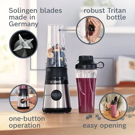 پارچ اسموتی ساز و مخلوط کن بوش MMB2111 از جنس تریتان است که بخصوص برای مواد غذایی مناسب است و عاری از هرگونه مواد مضر مثل BPA میباشد. یعنی وقتی از آن استفاده میکنید، مطمئن هستید که تمام نوشیدنیهایی که درست میکنید، سالم و خوشمزهاند. مثل یک دوست خوب که همیشه به سلامتی شما اهمیت میدهد.