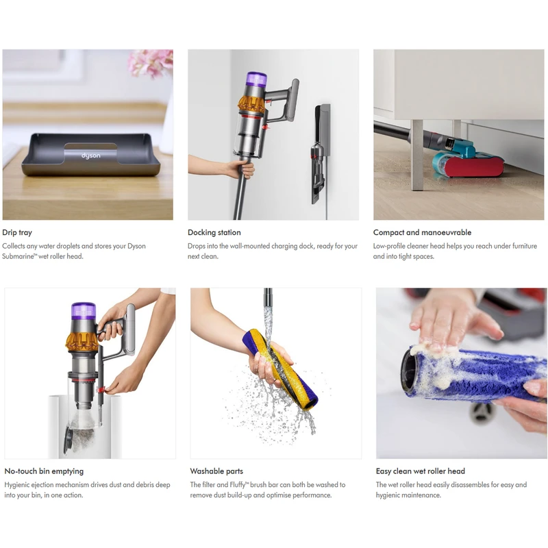 مخزن آب ۰.۲۵ لیتری، به دستگاه دایسون مدل v15s Submarine قابلیت جذب مایعات را می‌دهد. این ویژگی برای جمع‌آوری مایعات ریخته شده، بسیار کارآمد است و پس از استفاده، به راحتی قابل شستشو و آماده‌سازی برای استفاده بعدی است.