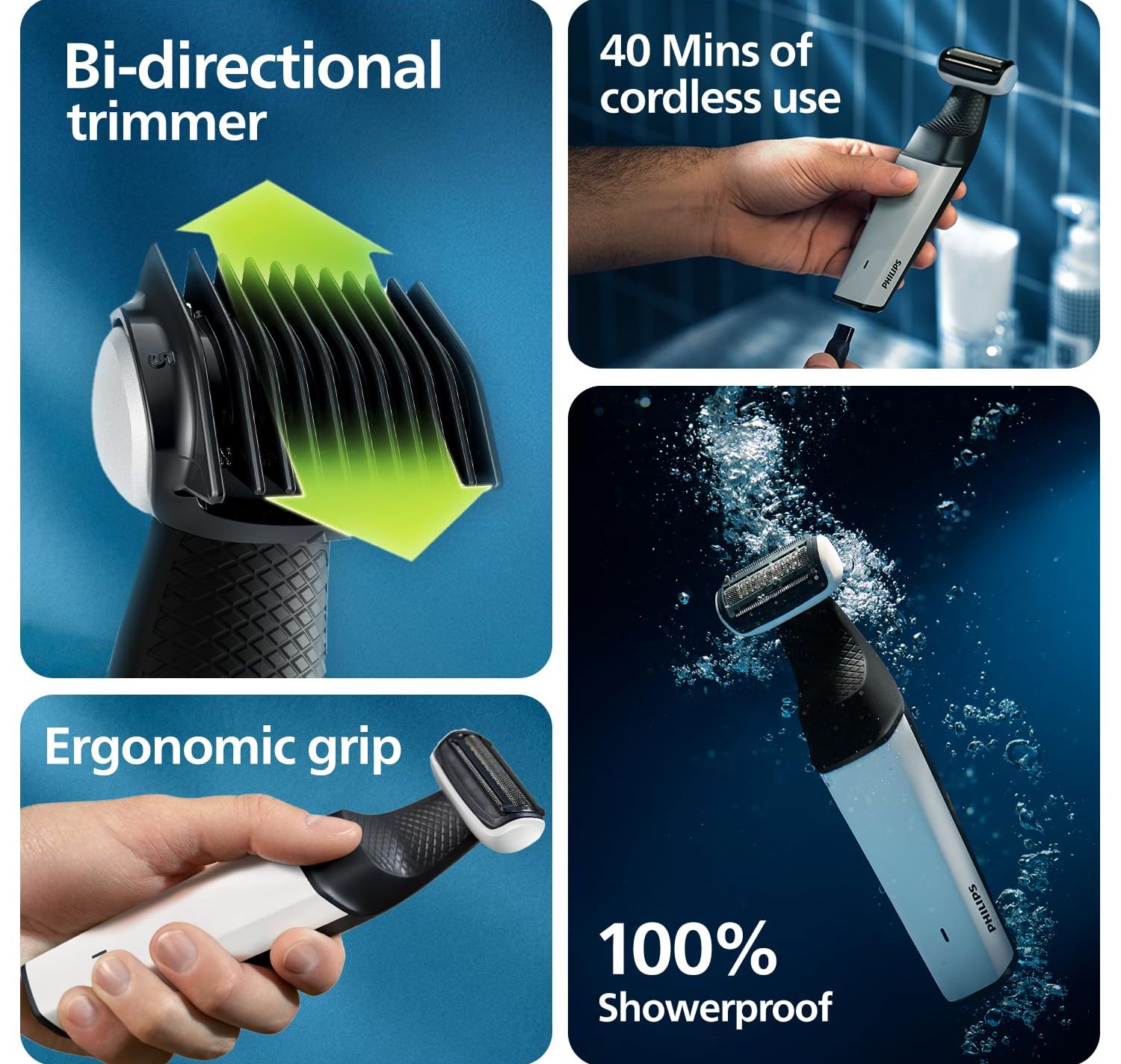 ماشین اصلاح موی بدن فیلیپس دارای فویل با دو تریمر در دو طرف است که بهترین تجربهی اصلاح را به شما ارائه میدهد. این ویژگی باعث میشود که در یک حرکت بتوانید اصلاحی دقیق و سریع داشته باشید. به عنوان مثال، اگر در حال اصلاح نواحی سختی مانند زیر بغل یا قسمتهای حساس هستید، این تریمرها کمک میکنند تا به سادگی موها را تحت کنترل داشته باشید و از آسیبدیدگی جلوگیری کنید.