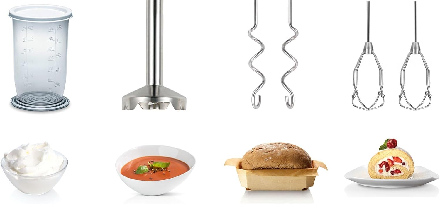 به‌علاوه، همزن دستی بوش MFQ4070 با لوازم همراهی شامل 2 میله همزن، 2 میله خمیرزن، گوشتکوب و پارچ شفاف با درب، امکانات متنوعی برای تهیه انواع دسرها و خمیرها در اختیار شما قرار می‌دهد. این لوازم جانبی به شما کمک می‌کنند تا از این همزن برای تهیه انواع خمیرهای نرم، کیک‌ها و غذاهای مختلف استفاده کنید.